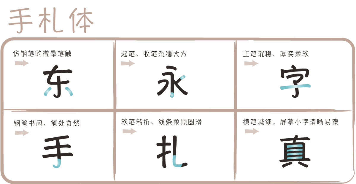 手札体有着如钢笔般书写的风格,笔触自然、沉稳大方,将墨水晕染纸张的质感,以清晰易读的结构,跃上屏幕呈现。