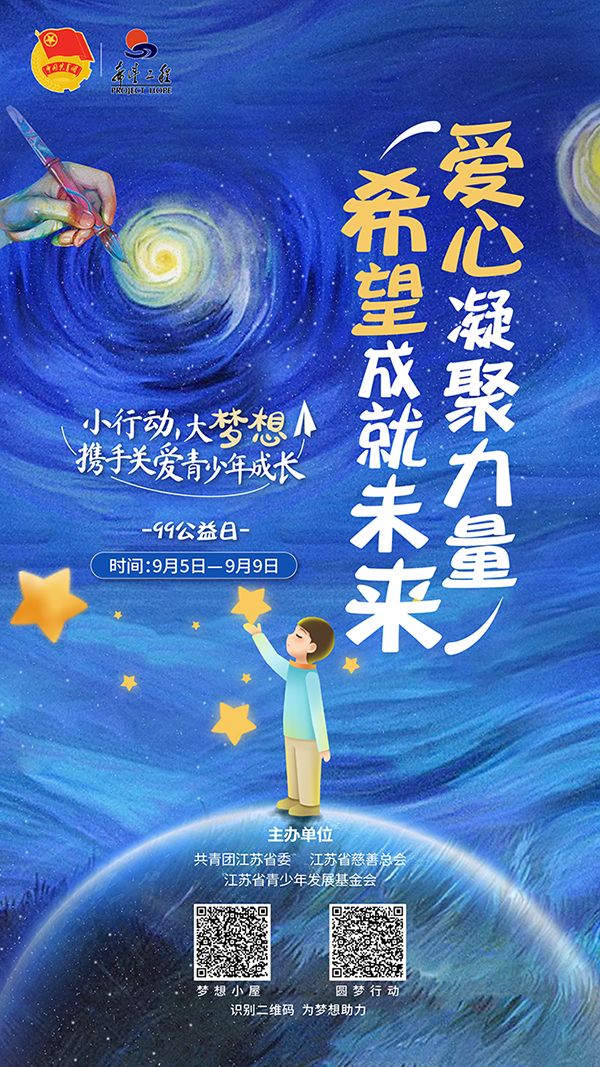 今年9月,共青团江苏省委、江苏慈善总会、江苏青少年发展基金会一起为即将到来的“99公益日”的希望工程项目发起“为梦想助力”活动,该活动海报由南京步锦文化传播有限公司设计而成。