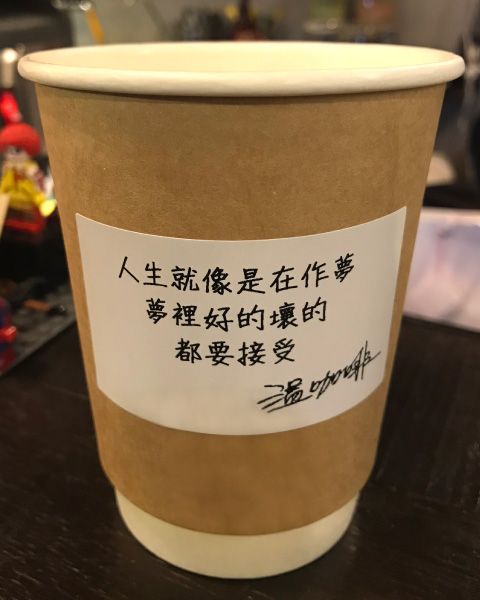 温咖啡的老板温秉錞几年前创业,透过每日一句语录印制杯身的做法,意外开创出自家咖啡店的特色。有些像是对生活的体悟,有些又是对人际关系的调侃,如"有时不是做不了决定,都是自己太不肯定"、"不怕神一样的对手,就怕快要生气的女友"。令人发笑的文字,引出更浓厚的咖啡好滋味,成为温咖啡吸引客人上门的一大亮点!