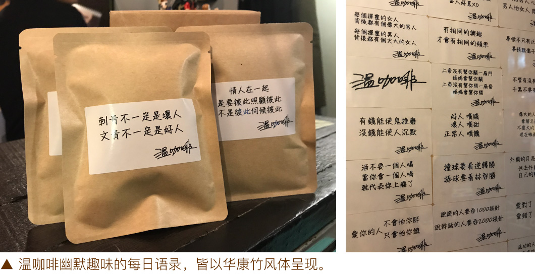 温秉錞老板说,当初一看到华康手书风系列──竹风体,就相当喜欢;既然每天都要印制在杯身,就希望字体风格不会过于潦草,但又期待带有那么点时下流行的文青感。竹风体如手写硬笔字的效果,中性潇洒,刚刚好的手感,正如温咖啡的温度!疗愈的咖啡、解忧的文句、手书的字体,萃酿出笑看生活的咖啡幽默。